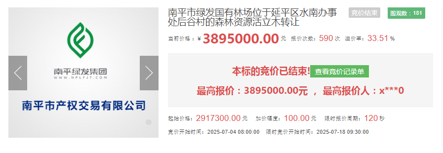 近日,延平區(qū)水南辦事處后谷村的森林資源活立木轉(zhuǎn)讓項目在南平市產(chǎn)權(quán)交易有限公司溢價成交。此次標(biāo)的掛牌價291.73萬元,成交價389.5萬元,溢價97.77萬元,溢價率33.51%,是南平市產(chǎn)權(quán)交易有限公司打造南平市綜合性要素平臺,不斷拓寬交易品種,下沉服務(wù)重心的有效嘗試。